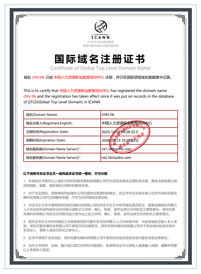 中国人力资源职业教育培训中心,经中华人民共和国香港特别行政区香港公司注册处(国家机关)批准成立,其业务性质以开展职业技能鉴定的实施和结果评价、培训、人才测评、证书发放等服务。